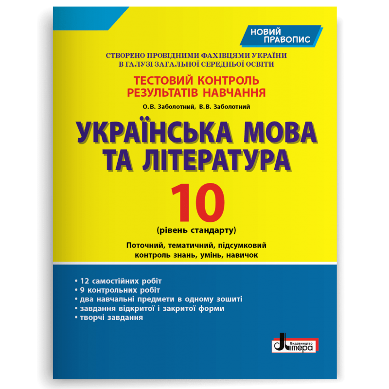 Посібник призначено для проведення поточного й контрольного оцінювання навчальних досягнень учнів з української мови та літератури в 10 класі. Укладено відповідно до чинних програм з обох предметів для 10–11 класів загальноосвітніх навчальних закладів (рівень стандарту). Тестові завдання розроблено з урахуванням моделі зовнішнього оцінювання, пропонованої Українським центром оцінювання якості освіти.