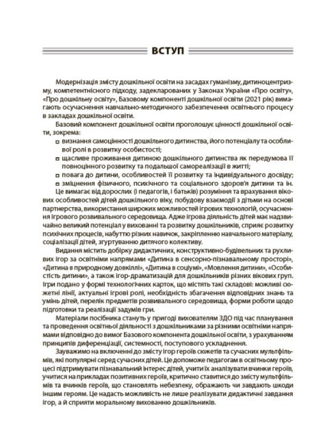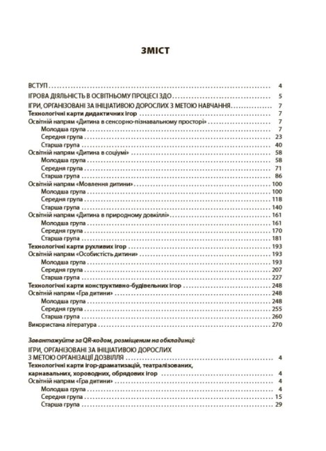 Дидактичні, рухливі, конструктивно-будівельні ігри та ігри-драматизації подано в зручній формі структурованих технологічних карт (можливі сюжетні лінії; актуальні ігрові ролі; необхідність збагачення відповідних знань та умінь дітей; перелік предметів розвивального середовища; форми роботи щодо підготовки та реалізації задумів гри). З іграми для навчання можна ознайомитися на сторінках посібника, а ігри для дозвілля — завантажити за QR-кодом, розміщеним на обкладинці.