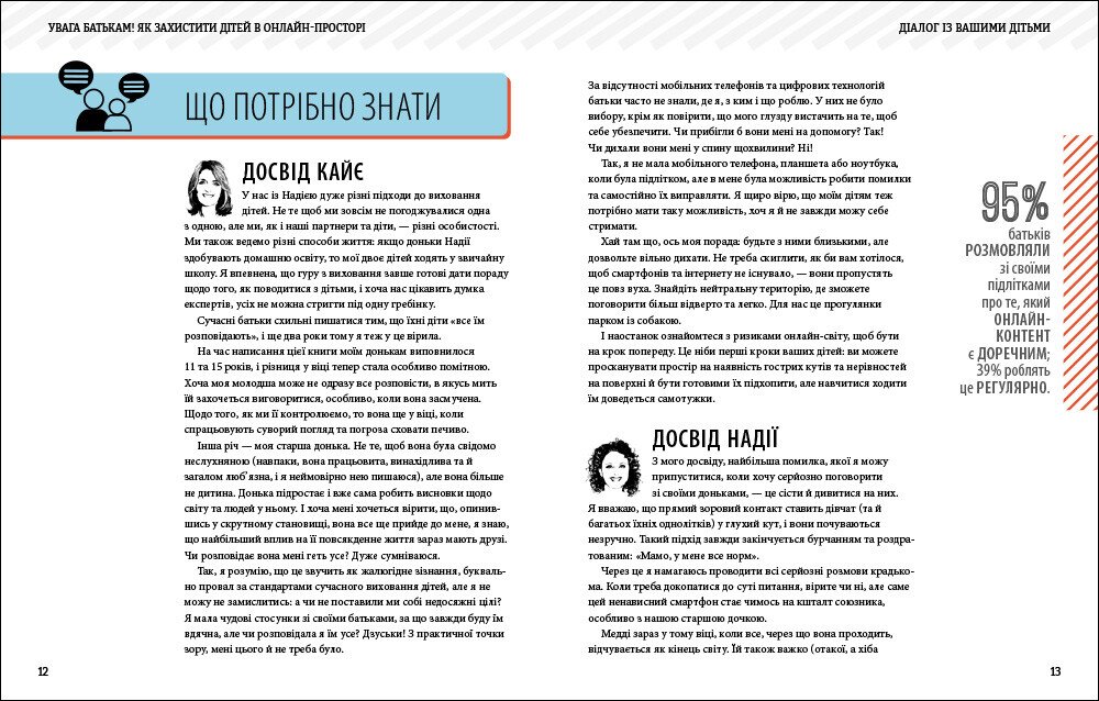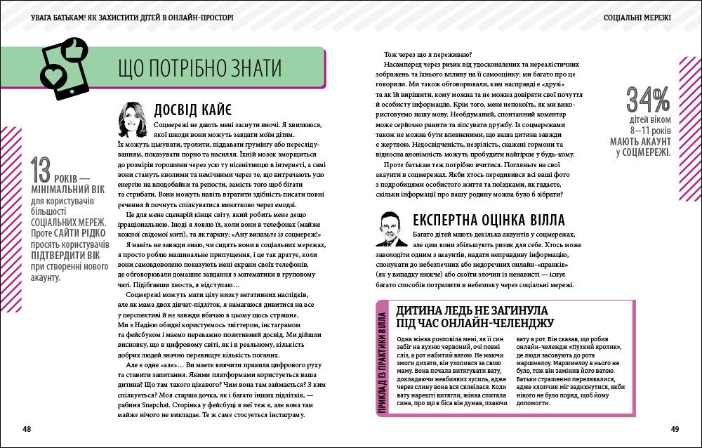 Чи знаєте ви, з якими небезпеками можуть зіткнутися діти в інтернеті? Як уберегти їх від кіберзалякування, фішингу, кіберпереслідування, грумінгу, секстингу та інших цифрових ризиків? До вашої уваги — видання одного з найавторитетніших видавництв DK, що присвячене саме цим темам. Автори книги — батьки. Вони ставлять ці важливі запитання міжнародному експерту з кібербезпеки Віллу Гедесу. Цей практичний посібник навчить вас вчасно і правильно допомагати дітям у разі виникнення проблем в онлайн-світі.