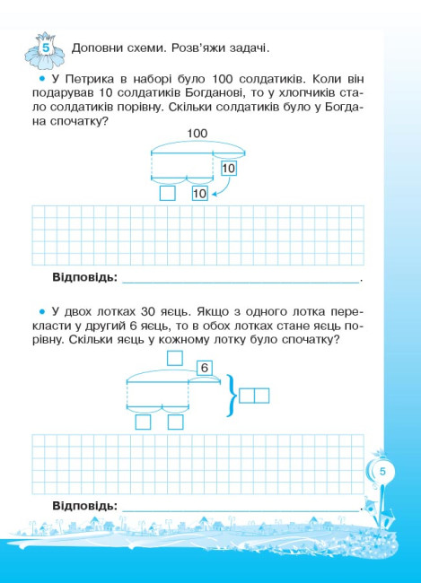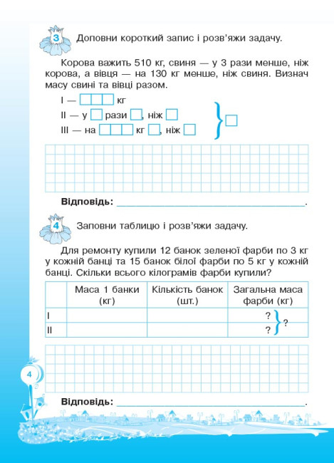 для початкових класів і містить завдання для навчання розв’язування задач у 4-му класі. Робочий зошит можна використовувати під час роботи з будь-яким підручником для 4-го класу. Він стане в пригоді вчителям,
