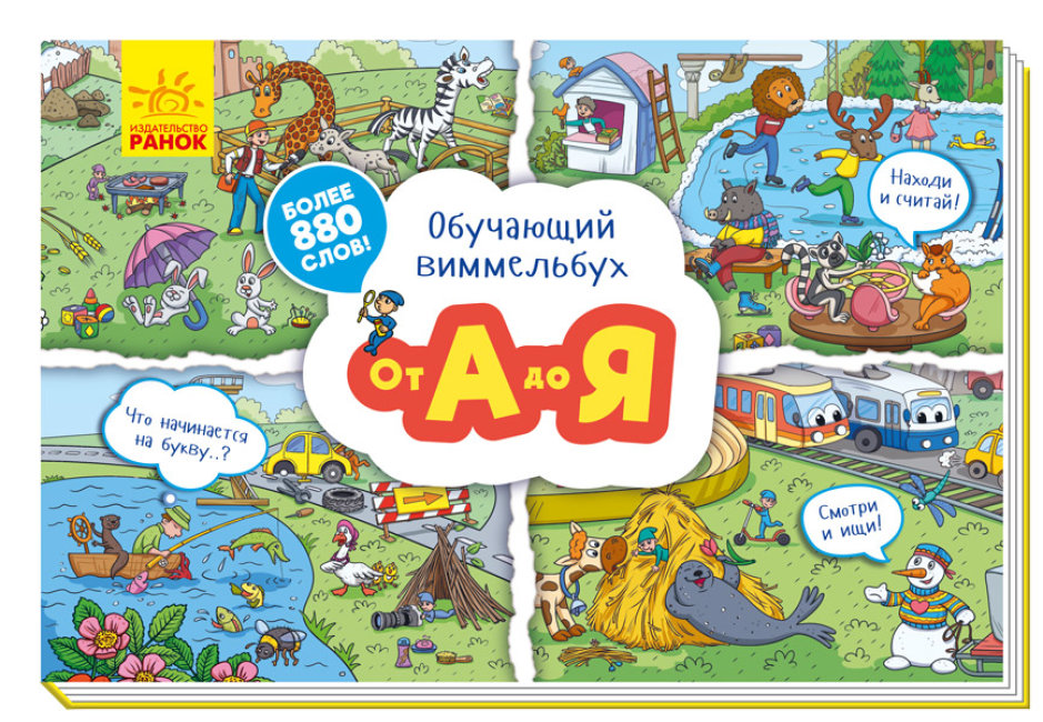 Навчальний вімельбух «Від А до Я» — це не тільки цікава книжка для розглядання, але й чудова абетка. На кожному її розвороті намальовано від 50 до 90 предметів для пошуку на зазначені букви. Також це чудовий привід зібратися всією родиною, роздивитися картинки, обговорити героїв і навіть позмагатися, шукаючи слова. В серії також представлені: Навчальний вімельбух «Від 1 до 10».