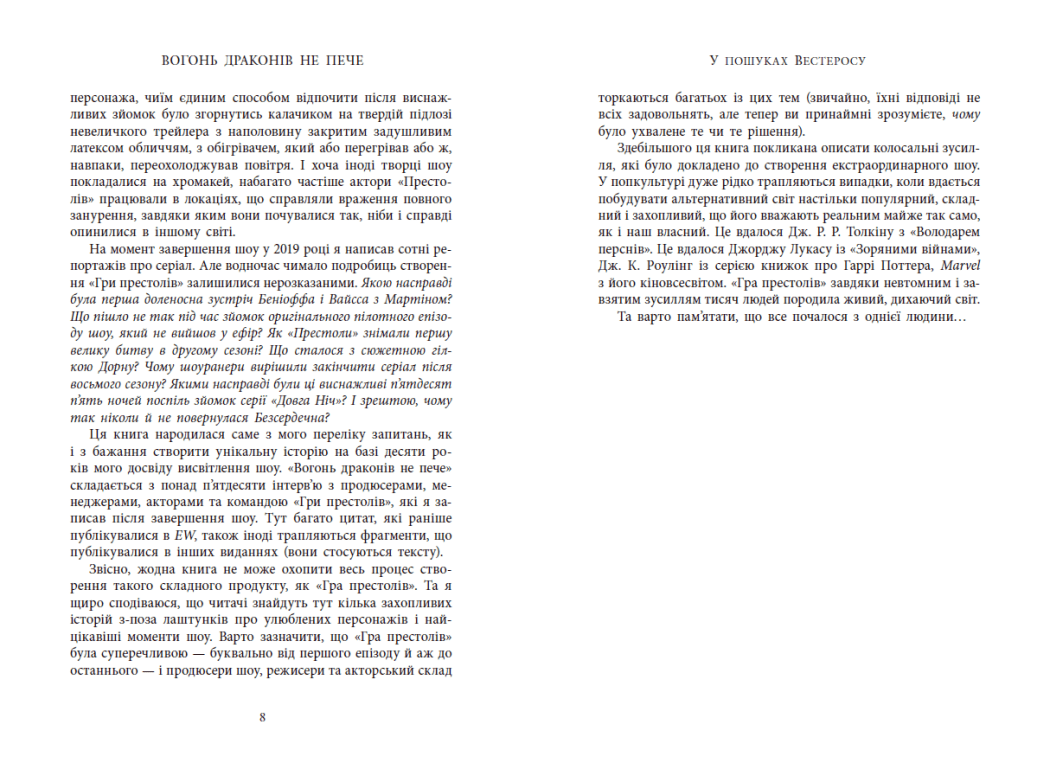 Джеймс Гібберд, американський журналіст, захоплений і натхненний тим, як знімали серіал «Гра престолів» за романами Джоржда Р.Р. Мартіна, запрошує читачів за лаштунки знімального процесу цього феноменального явища попкультури. До «Гри престолів» фентезі такого високого рівня на телебаченні просто не існувало, тож впоратися із цим завданням було під силу не кожному телеканалу. Як відбувалися переговори продюсерів з телеканалом НВО і прослуховування акторів, де знімали колосальну кількість сцен 8-сезонного серіалу, як робили костюми, як знімальна група боролася з негодою і тікала від фанатів, які стосунки були між акторами — про це та ще силу-силенну інших цікавих подробиць читач зможе дізнатися з вуст самих продюсерів і акторів, бо в книзі наведені цитати із понад пів сотні інтерв’ю з причетними до створення серіалу «Гра престолів».