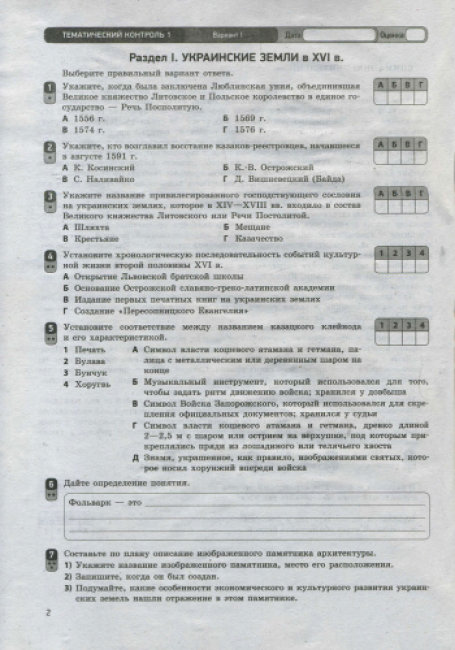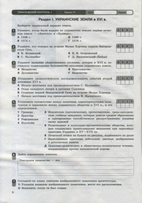 Тетрадь содержит задания для тематического и итогового контроля знаний учащихся, а также разработки всех практических занятий по курсу истории Украины.