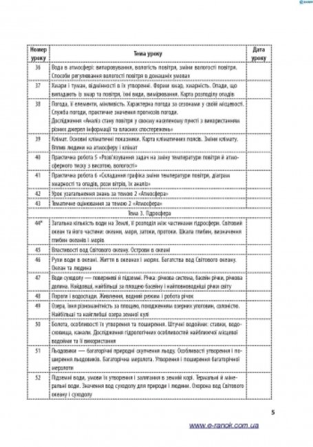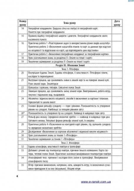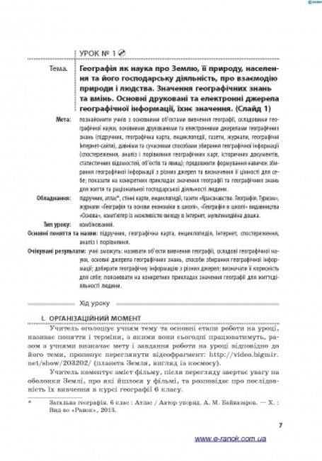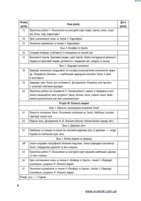 Посібник (автори Капіруліна С. Л., Бродовська О.Г.) складено згідно з новою навчальною програмою для загальноосвітніх навчальних закладів до курсу «Загальна географія», який викладається у 6 класі. Видання містить розробки усіх уроків, зокрема практичних робіт, тематичного оцінювання та узагальнення навчальних досягнень учнів.