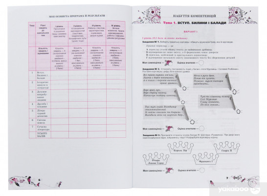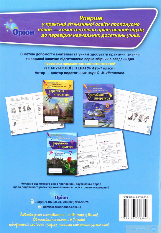 Гриф Міністерства освіти: Схвалено для використання у загальноосвітніх навчальних закладах У збірнику реалізовано компетентнісний підхід до викладання зарубіжної літератури відповідно до Державного стандарту базової і повної загальної сердньої освіти (2011 р.) і навчальеої програми із зарубіжної літератури для 5 – 9 класів (2012 р.; зі змінами 2015 р.). Збірник містить різнорівневі завдання для формування літературної компетентності, укладені до підручника із зарубіжної літератури для 7 класу (автори О. М. Ніколенко, Т. М. Конєва, О. В. Орлора та ін.). Видання забезпечує розширення прав і можливостей учнів у навчанні, сприяє розвитку інтересу до читання художньої літератури, дає змогу п’ятикласникам виявити здатність до самостійного мисленя, творчості, самооцінки пізнавальної діяльності. Формування предметної літературної компетентності узгоджується з розвитком ключових компетентностей (уміння вчитися, спілкуватися державною та іноземною мовами, інформаційно-комунікаційна, громадянська, загальнокультурна та ін.). Для перевірки умінь і навичок учнів 7 класу загальноосвітніх навчальних закладів з українською мовою навчання.